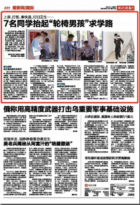 在华亿在线体育(中国)官方网站海洋学院的教室后排,静静地摆放着一张轮椅。轮椅是大三学生陈帆的,他因患先天性肌肉萎缩症,日常要靠轮椅出行,学习生活多有不便。幸运的是,张兴韧、尹鸣、王胤凯、王铭、梁健闯、郭磊、赵湘东7名同学成了他的好朋友,上课、打饭、拿快递、打扫卫生……他们合力“抬起”陈帆的求学路。