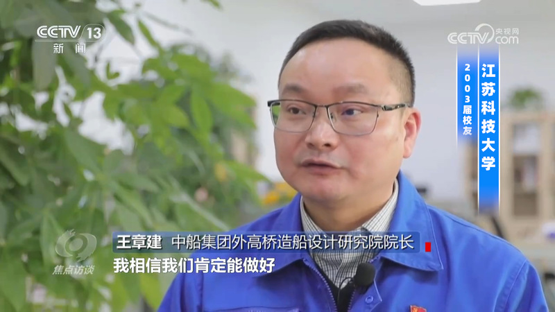“哪里有船,哪里就有江科大人!”2月19日,央视《焦点访谈》推出系列节目《干字当头开好局》,首站聚焦造船业。节目中,我校船舶与海洋工程学院2003届校友、中船集团外高桥造船设计研究院院长王章建受邀参与访谈。