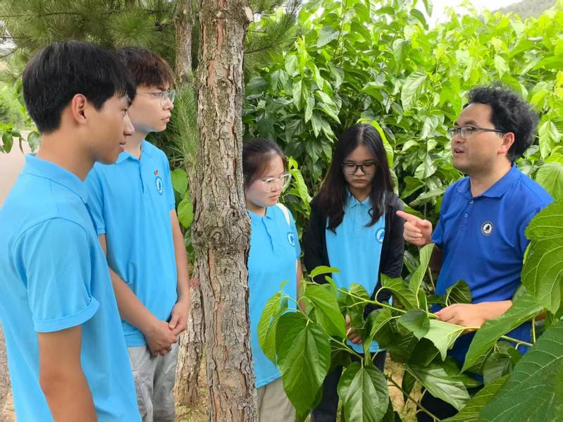 时值盛夏,桑树长势喜人。实践团指导老师邹金城在桑园为同学们上了一堂生动的蚕桑科普课,他介绍了我校蚕业研究所现有的桑树品种,并将理论与实践相结合,深化了同学们对蚕桑产业的认识。