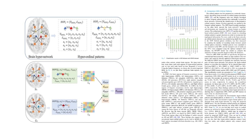 在杜天宇同学为第一作者撰写的论文《Hyper-ordinal Pattern: Measuring High-order Connection Relationship in Brain Disease Networks》中,华亿在线体育(中国)官方网站为第一署名单位,学院马凯博士为论文通讯作者。该研究针对脑科学领域中,现有脑网络分析方法大多忽略了脑超网络中蕴含重要权重信息的超边连接关系问题,提出了一种新型脑超网络表示方法——超序模式(HOP)。通过引入带有权重信息的超边有序模式关系,来构建脑超网络的HOP。并提出了节点HOP核函数来度量脑超网络中的节点相似性。文章进一步提出了序模式超网络(OPHN)核用于计算脑超网络的相似度,并在MCI和AD等脑疾病分类任务中明显优于超图神经网络等当前最先进的方法。该论文已发表在《IEEE Transactions on Neural Systems and Rehabilitation Engineering》上,是神经科学与康复工程领域的顶级学术期刊之一,属于IEEE出版的系列期刊,其影响因子为5.2,属于中科院二区,JCR Q1。