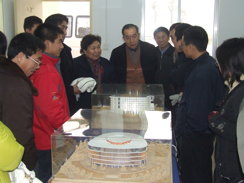 2006年,老领导观看校区新校园建筑模型(中间右为祝山、左为冷静)