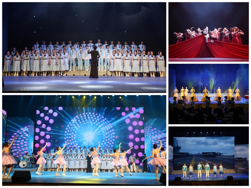 第三篇章“云驰·星河逐梦”汇聚国风与青春交融之美。大学生艺术团流行乐团、合唱团及经济管理学院等联袂呈现国风盛典《天地龙鳞》,歌曲承载着历史的厚重感与民族复兴的壮志豪情,与融合非遗技艺和现代设计的华服相得益彰,尽显中华文明之美;新晔戏剧团带来朗诵《逐梦深蓝,我们正青春》,以铿锵之声将青春誓言锻造成一曲献给深蓝的壮丽诗篇;舞蹈团演绎舞蹈《红色之恋》,以鲜明的红色主题致敬革命岁月,传递信仰力量;合唱团演唱的《星辰大海》,让观众在歌声中沉浸式感受如星辰般璀璨、如大海般澎湃的希望力量。晚会尾声,合唱团、舞蹈团、吉他协会与外国语学院等联袂呈现歌舞《想要的一定实现》,将现场氛围推向高潮,为整场晚会画上圆满句号。