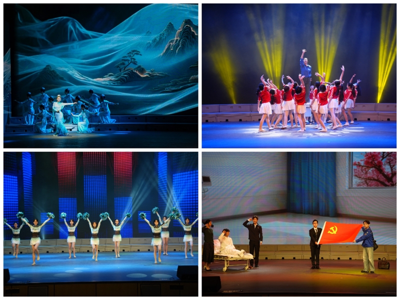第一篇章“风起·时代开卷”中,环境与化学工程学院舞蹈《一条大河》,以舒展的舞姿勾勒出山河壮阔的美丽图景;理学院、机械工程学院、能源与动力学院联合演绎的表演唱串烧《岁月赠我以歌》,用经典旋律传递美好与暖意;海洋学院音诗画《梧桐叶上的年轮》,以诗意表达诠释和平的珍贵与青年的使命担当;经济管理学院合唱《追寻》,用饱满的情感唱出青年学子对热爱的坚守和对理想的追求。