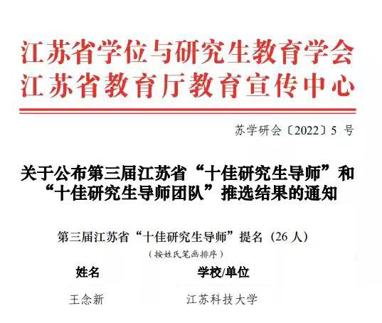 近日,由江苏省教育厅、江苏省学位与研究生教育学会、江苏教育报刊总社联合开展的第三届江苏省“十佳研究生导师”和“十佳研究生导师团队”评选结果揭晓,我校经济管理学院王念新教授荣获“十佳研究生导师”提名。